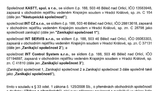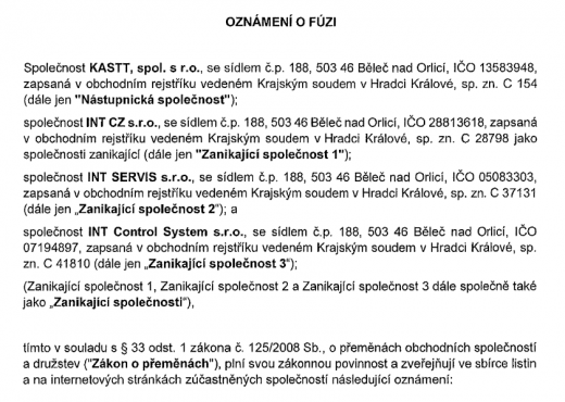 Oznámení o fúzi společností INT CZ, s.r.o., INT SERVIS s.r.o., INT Control System s.r.o. a KASTT, spol. s r.o. pro věřitele, společníky, zaměstnance a o založení projektu do sbírky listin