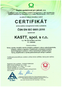 Společnost KASTT je držitelem certifikátů kvality Eurovent, TÜV SÜD a ČSN EN ISO 9001:2016 pro výrobu rotačních regeneračních výměníků tepla a vlhkosti.
